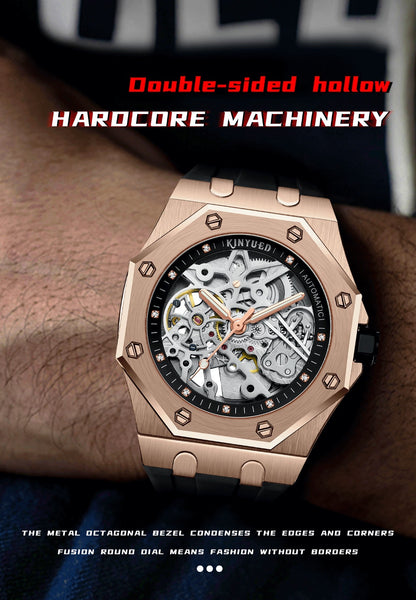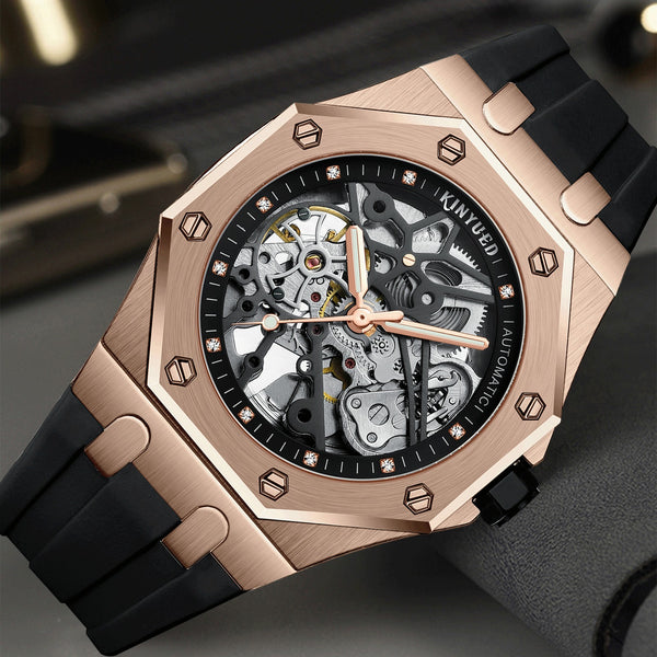 Redefine timekeeping with the Prak Kinyued Automatic Wrist Watch — where precision meets timeless style. Crafted with a self-winding automatic movement, this watch harnesses the motion of your wrist to keep perfect time, eliminating the need for batteries. Its transparent skeleton dial showcases the intricate mechanical artistry within, letting you witness the heartbeat of your watch in motion.