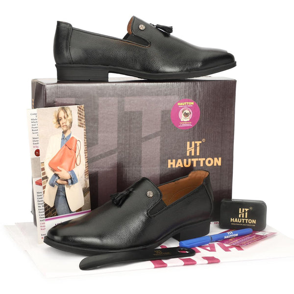 The Hautton genuine leather slip-on shoe are a stylish and durable choice for footwear. These shoes feature high-quality genuine leather construction, providing both comfort and longevity. Slipon shoes are known for their classic design, typically featuring elastic side panels and a pull-on tab at the back, making them easy to wear and take off.